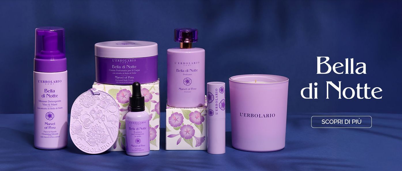 Scopri la linea Bella di Notte: il profumo spray oppure solido, la mousse detergente viso e mani, la crema corpo profumata e l’elisir corpo e capelli. Non solo: la collezione comprende anche irresistibili prodotti per ambienti e meravigliosi kit da regalare!Al tramonto, nelle calde sere d’estate, il fiore della Bella di Notte o Mirabilis jalapa dischiude i suoi petali colorati per lasciar trapelare la sua bellezza discreta e misteriosa. A questo fiore variopinto è dedicata la linea profumata L’Erbolario: una collezione caratterizzata da un profumo femminile elegante, fiorito e vanigliato, declinato in tanti prodotti per il corpo.